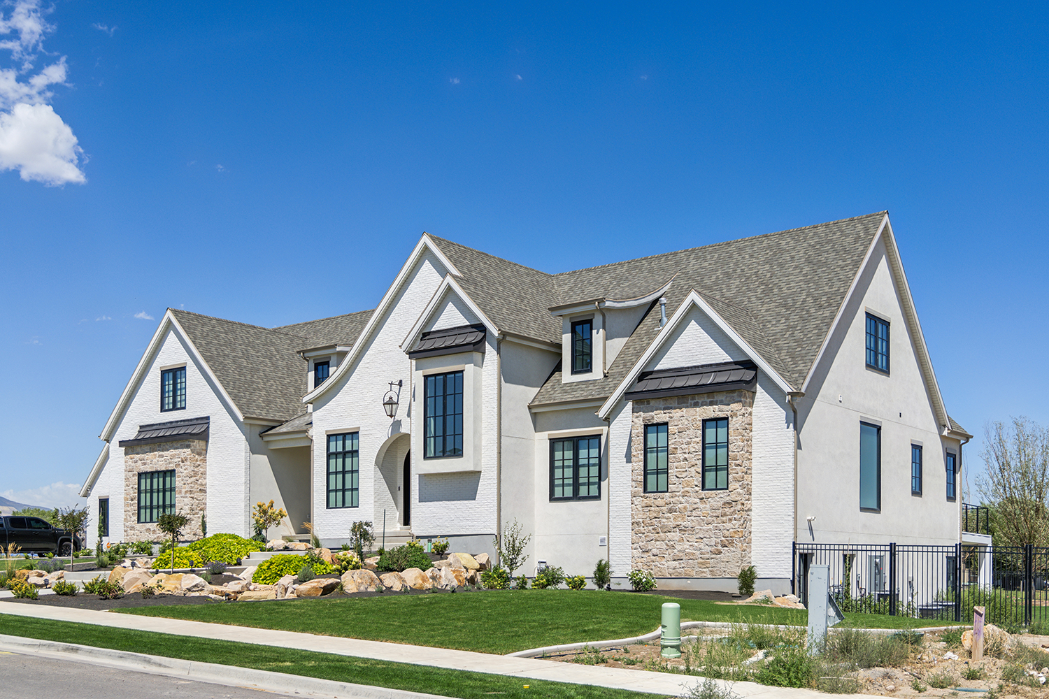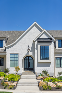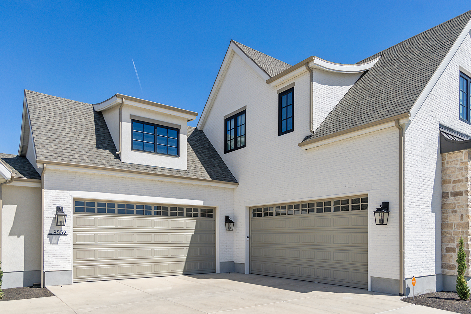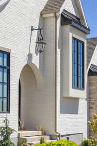 Custom home designed by Christine from Honey Built Home features a unique 50/50 mixology of Alpaca and Timberwolf Orchard Limestone, grouted with Spec Mix White Mortar in an overgrout application. The home exterior also features an extensive use of Creative Mines Loft Paintgrade Brick which was painted with Romabia Masonry Paint.