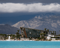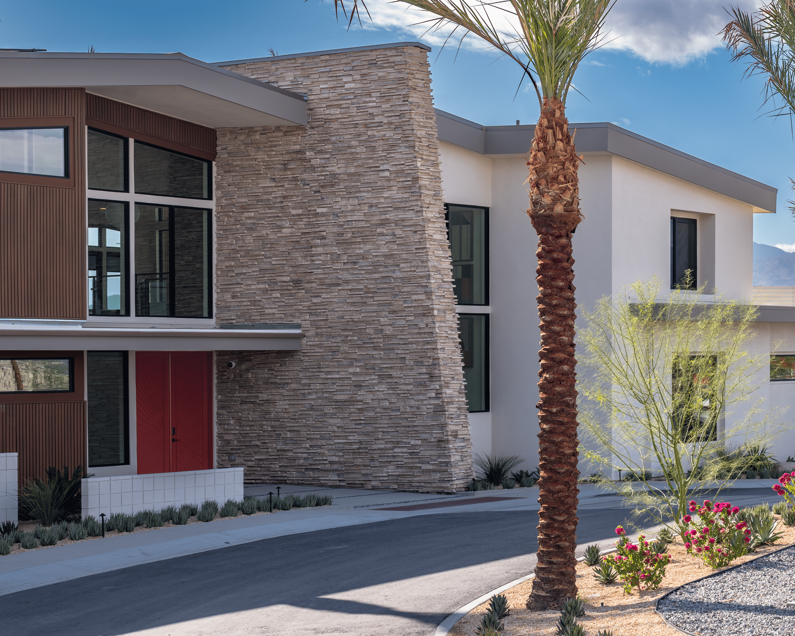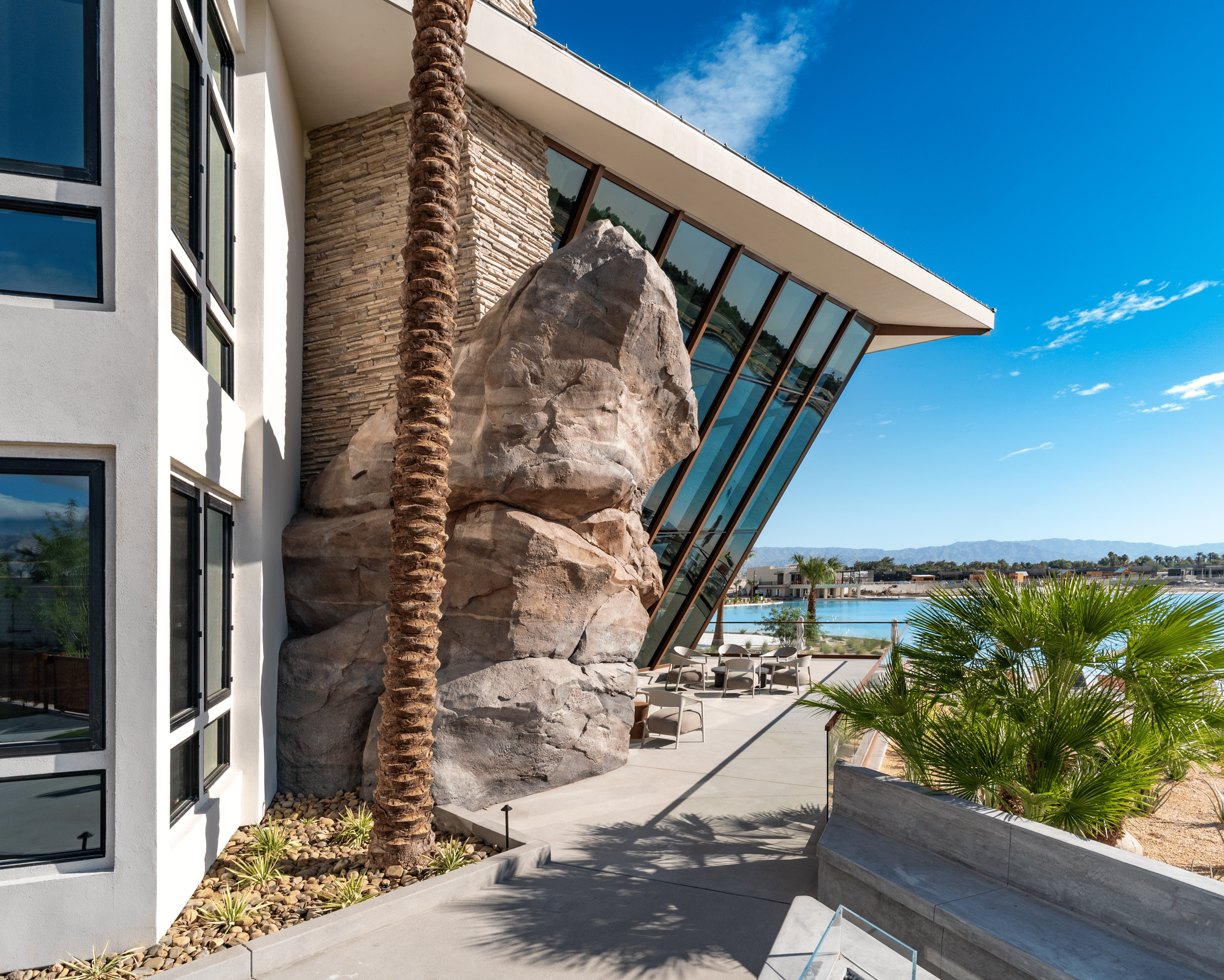 A defining landmark within the Cotino community, The Parr House expresses Mid-Century Modern design through its honest use of glass, steel, and stone. With floor-to-ceiling windows overlooking Cotino Bay, the space blurs the line between interior and landscape, a true reflection of modern desert living. For this architectural statement, Creative Mines developed a custom profile inspired by the natural stone formations of Frank Lloyd Wright’s Fallingwater, infusing the structure with texture, warmth, and a handcrafted authenticity that complements its sleek geometry.